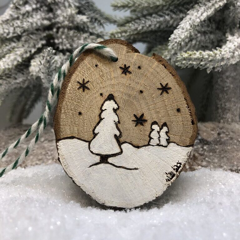 Chaque décoration que je confectionne est le résultat d‘un travail minutieux. Les rondelles de bois, sélectionnées avec soin, sont pyrogravées et peintes à la main. Cette attention aux détails confère à chacune de mes décorations de Noël en bois une beauté singulière, faisant de chaque pièce une œuvre unique qui évoque la chaleur de la saison.