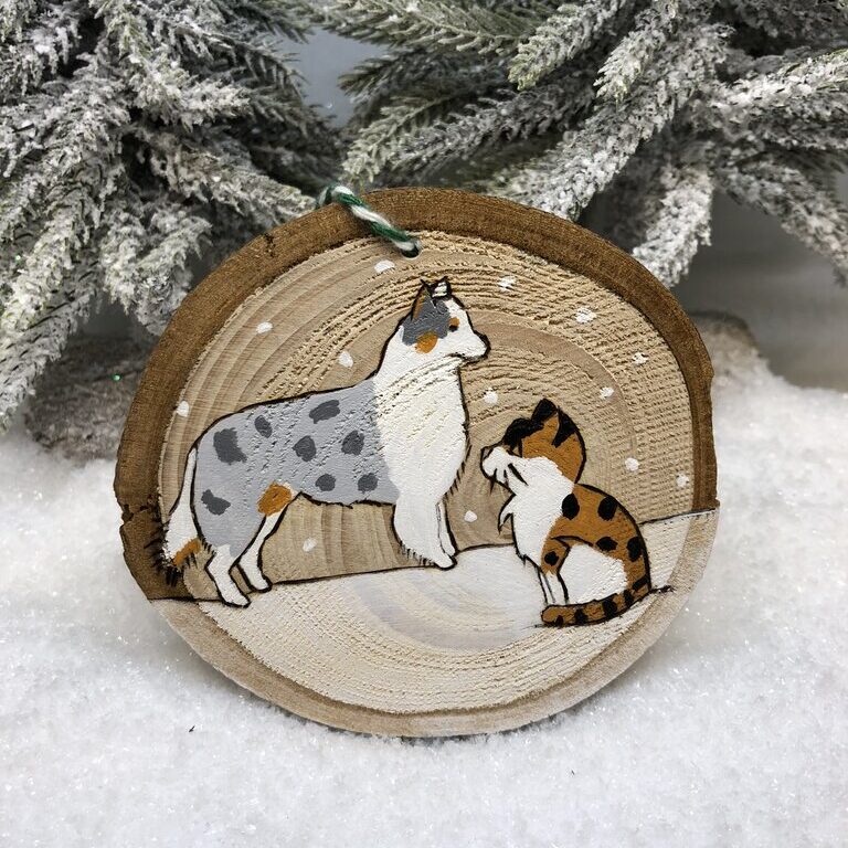 Chaque décoration de Noël en bois est méticuleusement travaillée, pyrogravée et peinte à la main avec une grande précision. Utilisant les photos de vos animaux, je choisis les couleurs qui reflètent au mieux leurs personnalités, créant ainsi une pièce mémorable pour les fêtes de fin d’année.