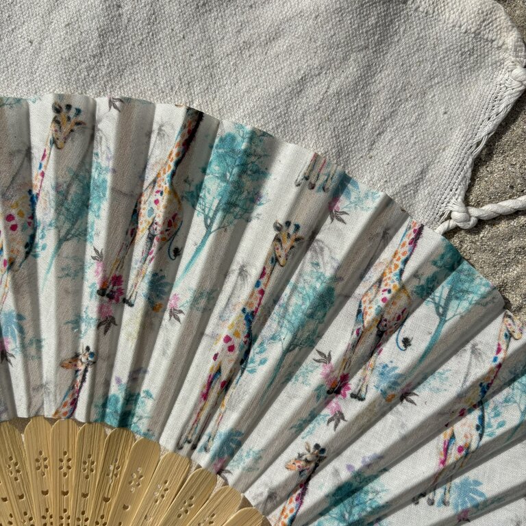 Découvrez l’élégance de cet éventail personnalisé en tissu à motif girafes multicolores : fraîcheur, qualité et durabilité en un geste ! Avec son tissu aux tons colorés, cet éventail fabriqué à la main combine élégance et engagement durable. Confectionné avec un tissu répondant aux normes OEKO-TEX, cet éventail est le choix idéal pour ceux qui cherchent à allier style et respect de l’environnement.