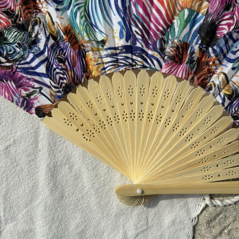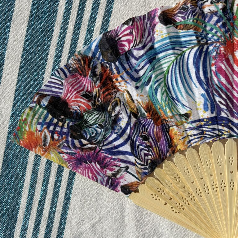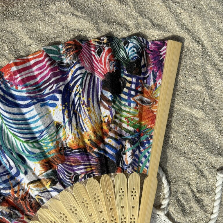 Commandez dès maintenant votre éventail personnalisé en tissu à motif tropical et zèbres multicolores