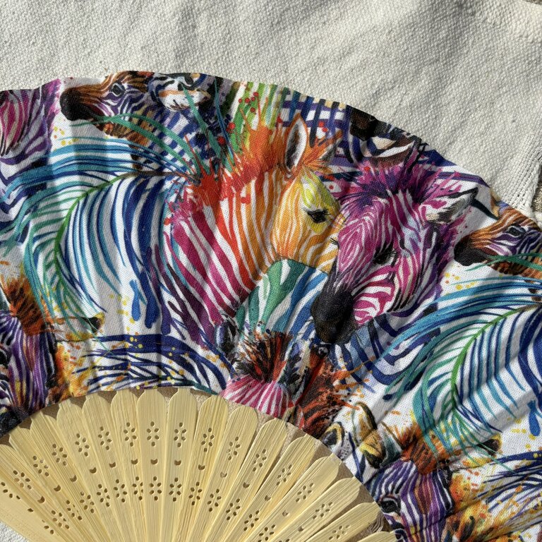 Découvrez l’élégance de cet éventail personnalisé en tissu à motif tropical et zèbres multicolores : fraîcheur, qualité et durabilité en un geste ! Avec son tissu au style tropical, cet éventail fabriqué à la main combine élégance et engagement durable. Confectionné avec un tissu répondant aux normes OEKO-TEX, cet éventail est le choix idéal pour ceux qui cherchent à allier style et respect de l’environnement.