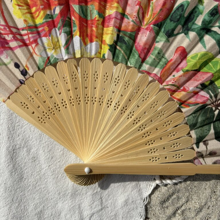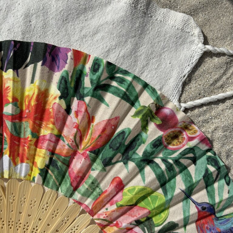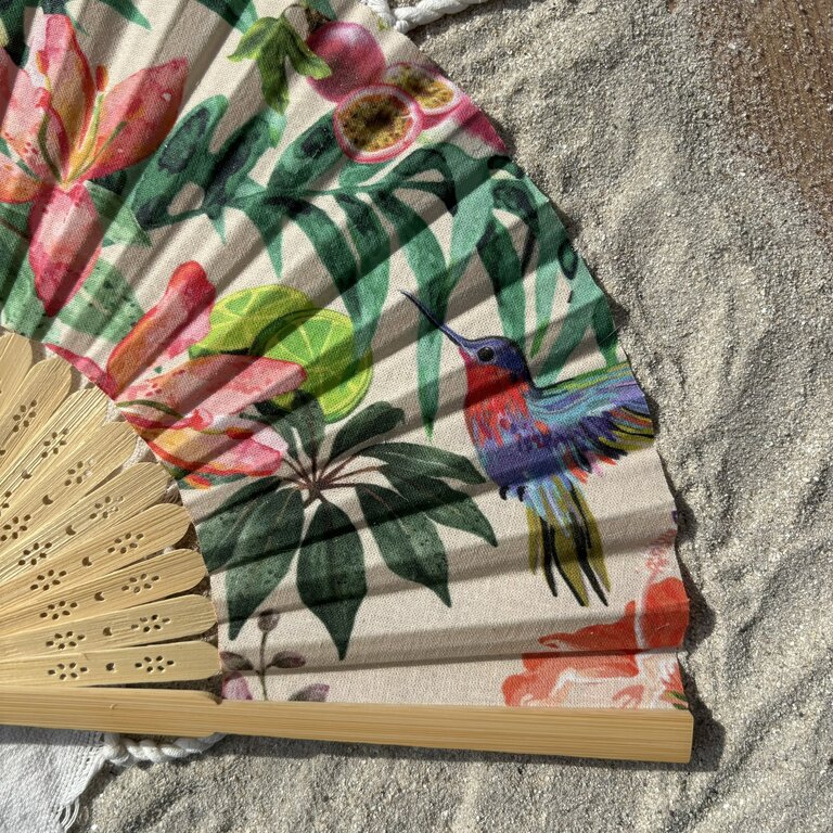 Commandez dès maintenant votre éventail personnalisé en tissu à motifs colibris et fleurs tropicales