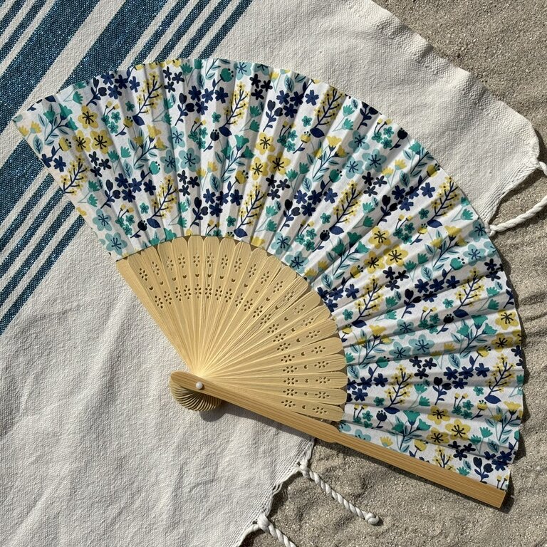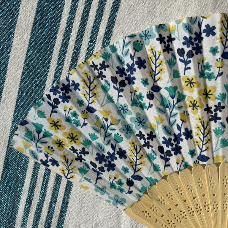Commandez dès maintenant votre éventail personnalisé en tissu à petites fleurs bleues et jaunes
