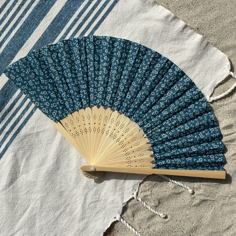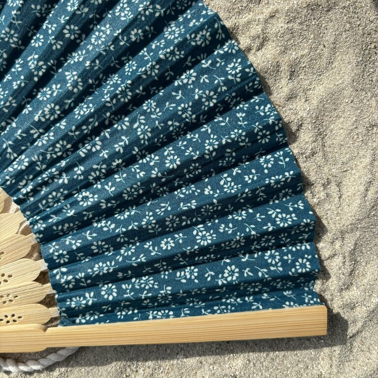 Commandez dès maintenant votre éventail personnalisé en tissu bleu à petites fleurs blanches