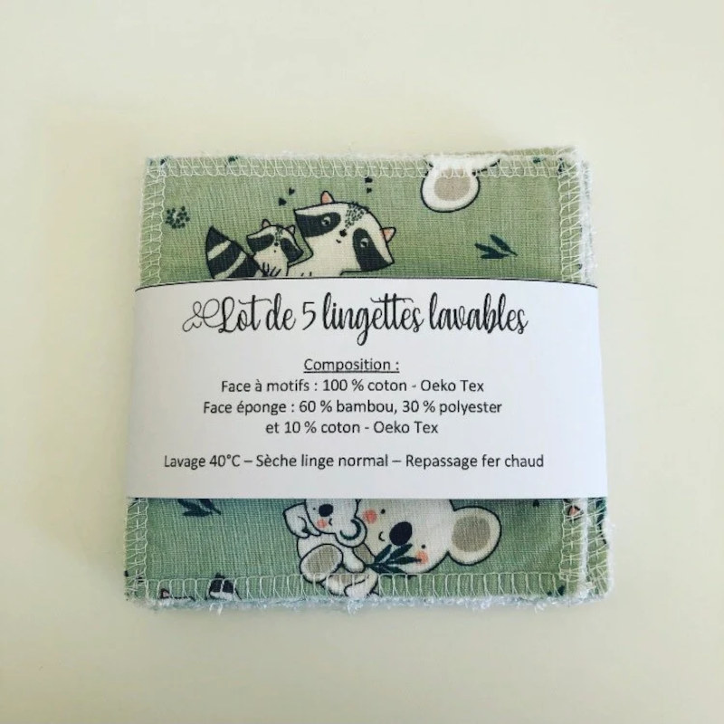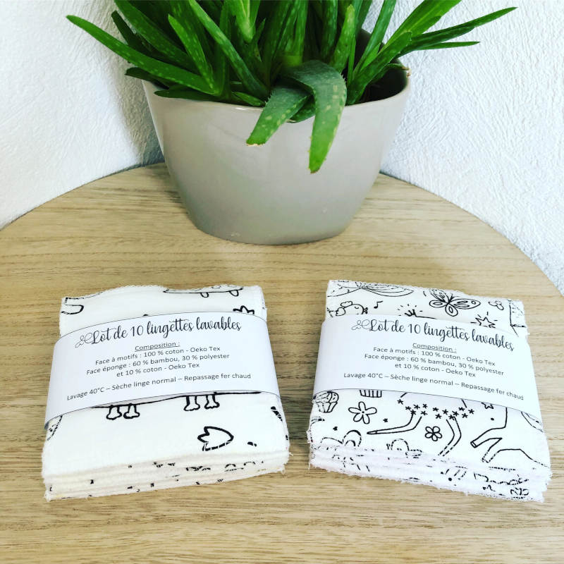 Chaque lingette est composée de deux faces : une face à motifs 100 % coton certifié Oeko-Tex et une face éponge en bambou (60 % bambou, 30 % polyester, 10 % coton – Oeko-Tex). Le bambou est particulièrement apprécié pour sa douceur et son fort pouvoir absorbant, ce qui le rend idéal pour la toilette de bébé, la toilette du visage ou le démaquillage.