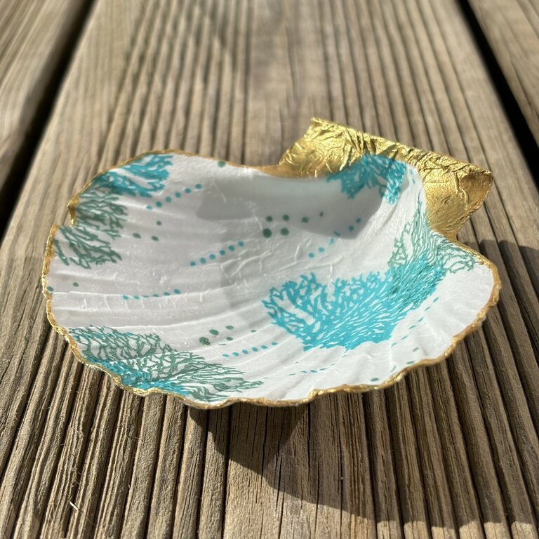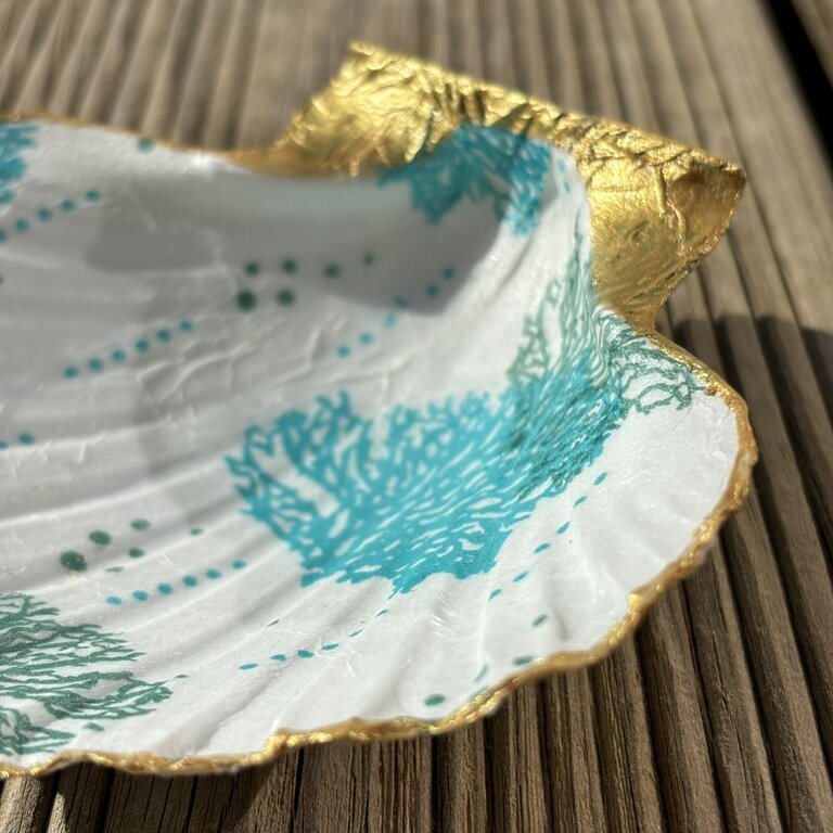 Chaque coquille que je sélectionne est soigneusement choisie et transformée avec respect pour son histoire et sa provenance. J’embellis chaque coquille avec des dorures effectuées à la main, offrant ainsi un support unique où le design artisanal rencontre la beauté naturelle de la mer.