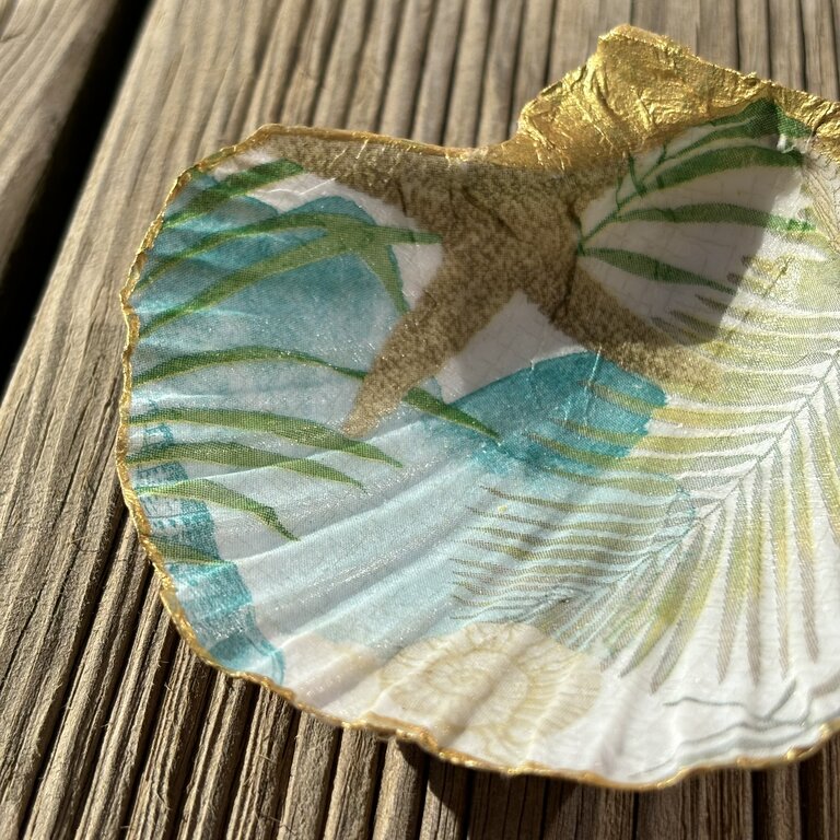 Chaque coquille que je sélectionne est soigneusement choisie et transformée avec respect pour son histoire et sa provenance. J’embellis chaque coquille avec des dorures effectuées à la main, offrant ainsi un support unique où le design artisanal rencontre la beauté naturelle de la mer.
