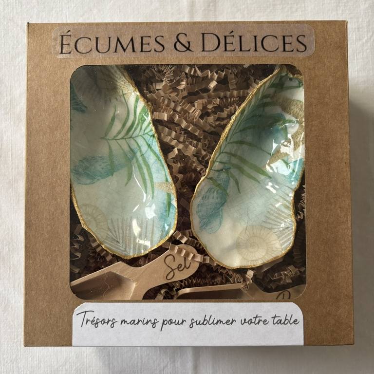 Présenté dans un coffret kraft, ce duo comprend deux coquilles (sel et poivre) et deux cuillères en bois gravées. Leur format compact et décoratif s’invite avec élégance sur une table estivale, un brunch en terrasse ou un repas de fête. C’est aussi une belle manière d’ajouter une touche personnelle et naturelle à votre quotidien.