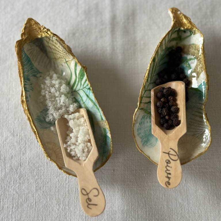Ce duo salière et poivrière originale marine vous transporte sur les rivages de l’Atlantique grâce à son motif délicat évoquant les coquillages, les fougères marines et les empreintes fossilisées. Chaque coquille d’huître, collectée en Pays Bigouden (dans le sud du Finistère), est soigneusement nettoyée, décorée et orée à la main et garnie d’un motif imprimé dans des tons doux de turquoise et de beige. Une résine transparente protège l’intérieur de la coquille tout en lui conférant une finition brillante et durable, adaptée au contact alimentaire.