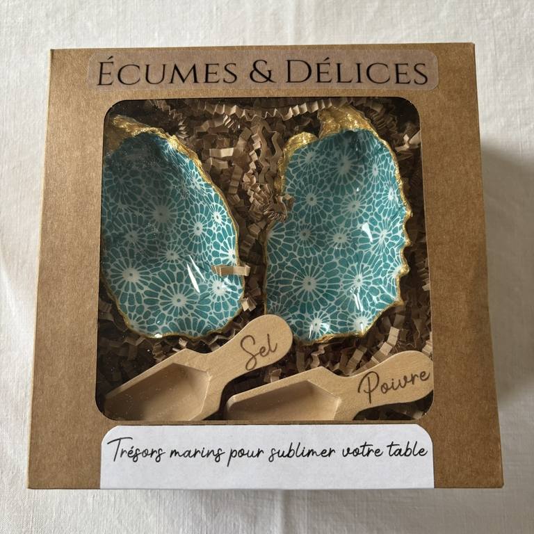 Le coffret comprend deux coquilles assorties, accompagnées de cuillères en bois gravées “Sel” et “Poivre”. Leur format compact les rend idéales pour une table de fête, un dîner d’été, ou un pique-nique raffiné. Leur aspect décoratif permet aussi de les laisser visibles dans une cuisine ou sur un buffet.